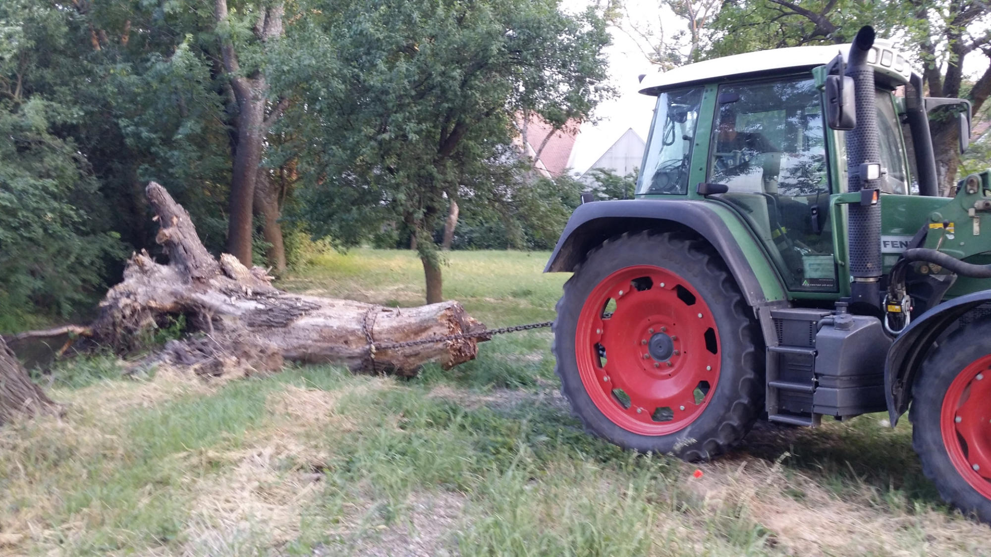 Baumstamm mit Traktor mittels Kette aus Bach entfernt |