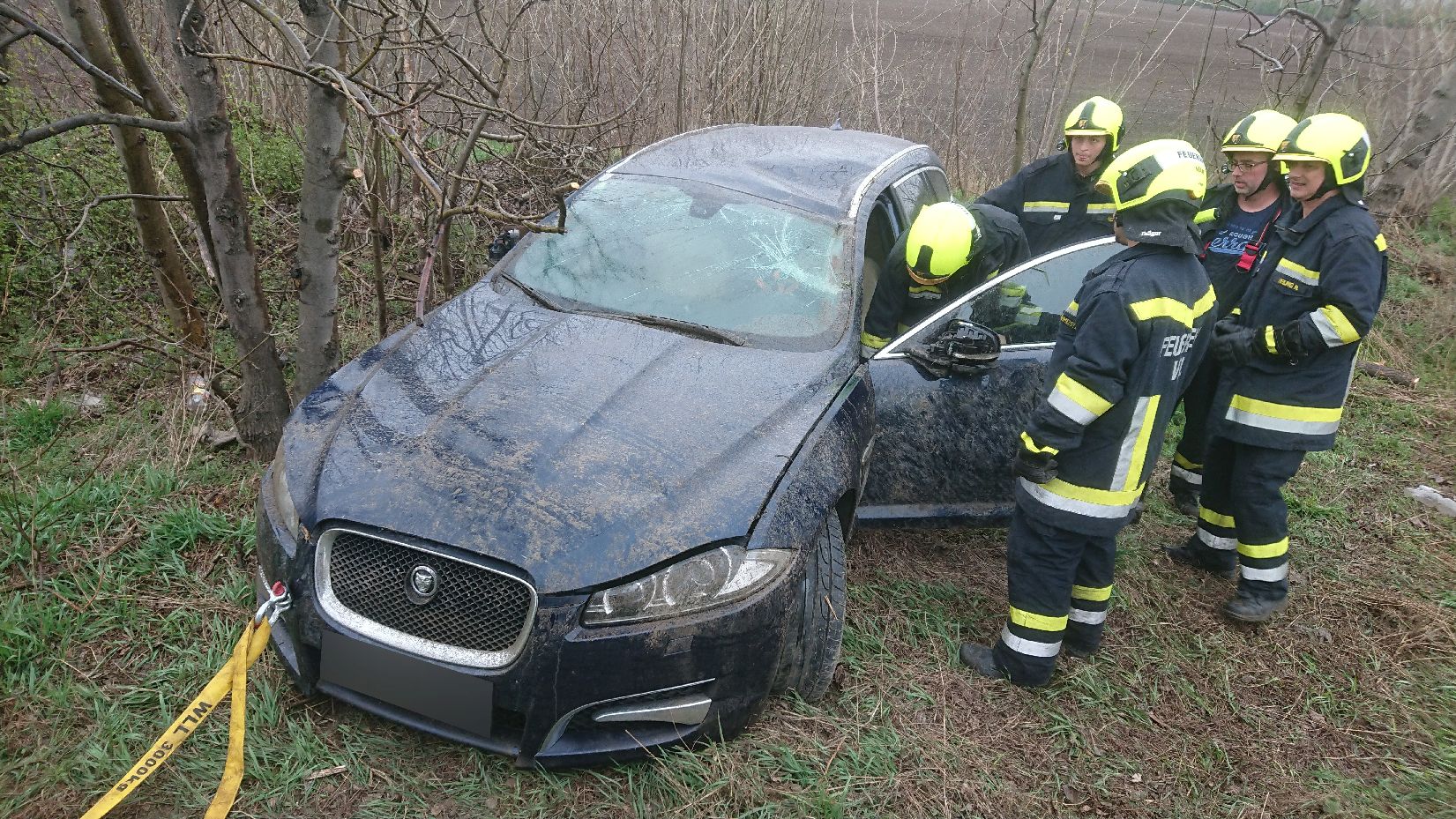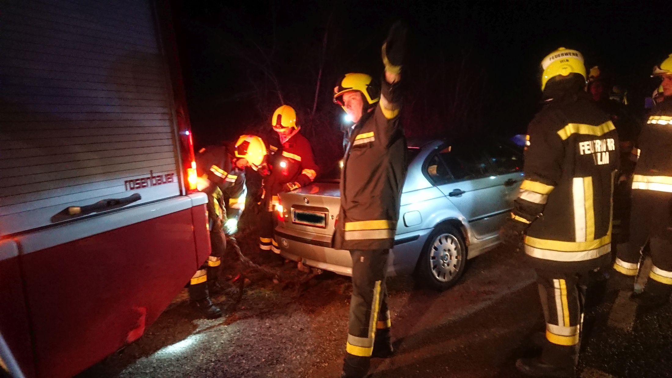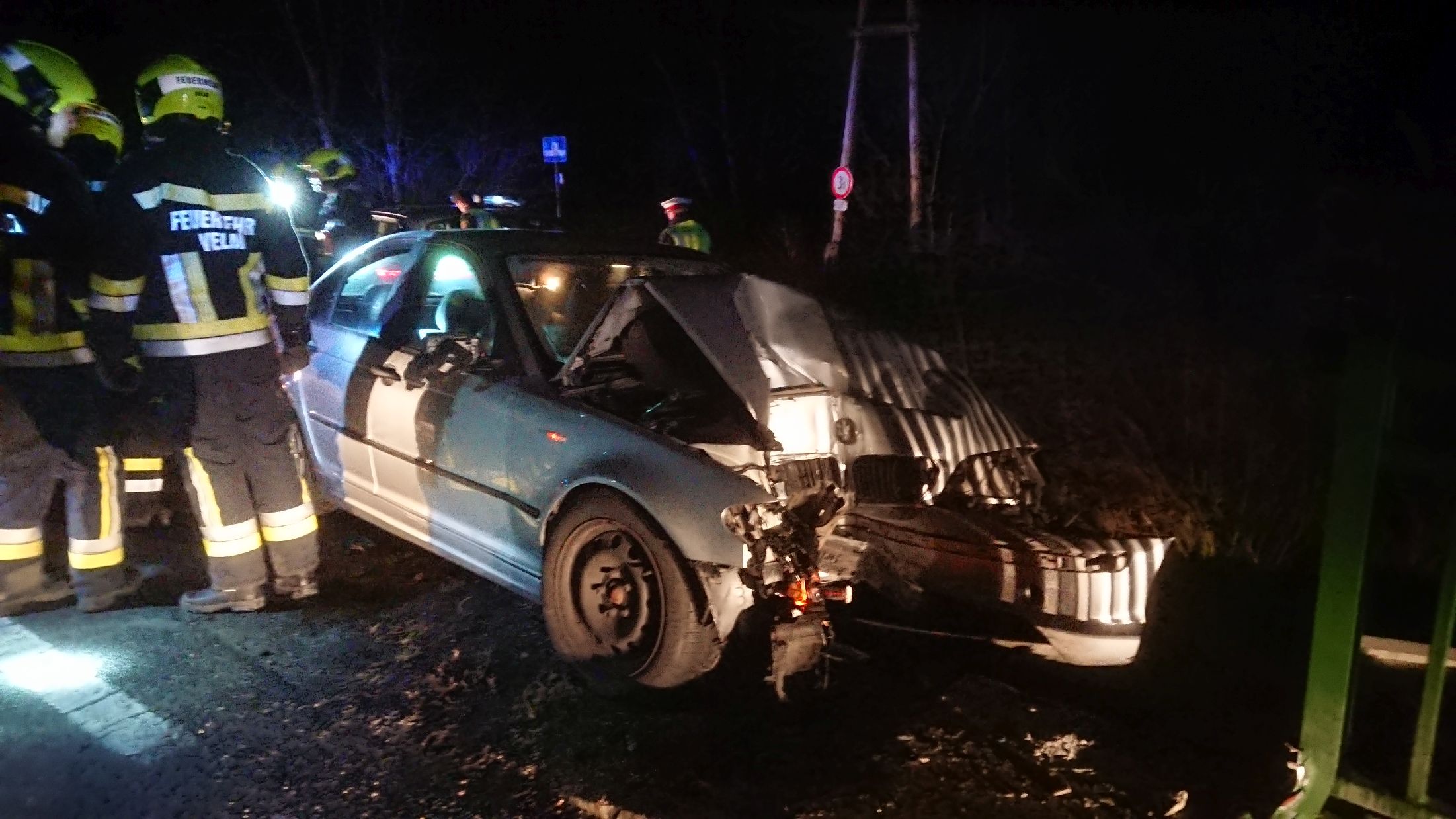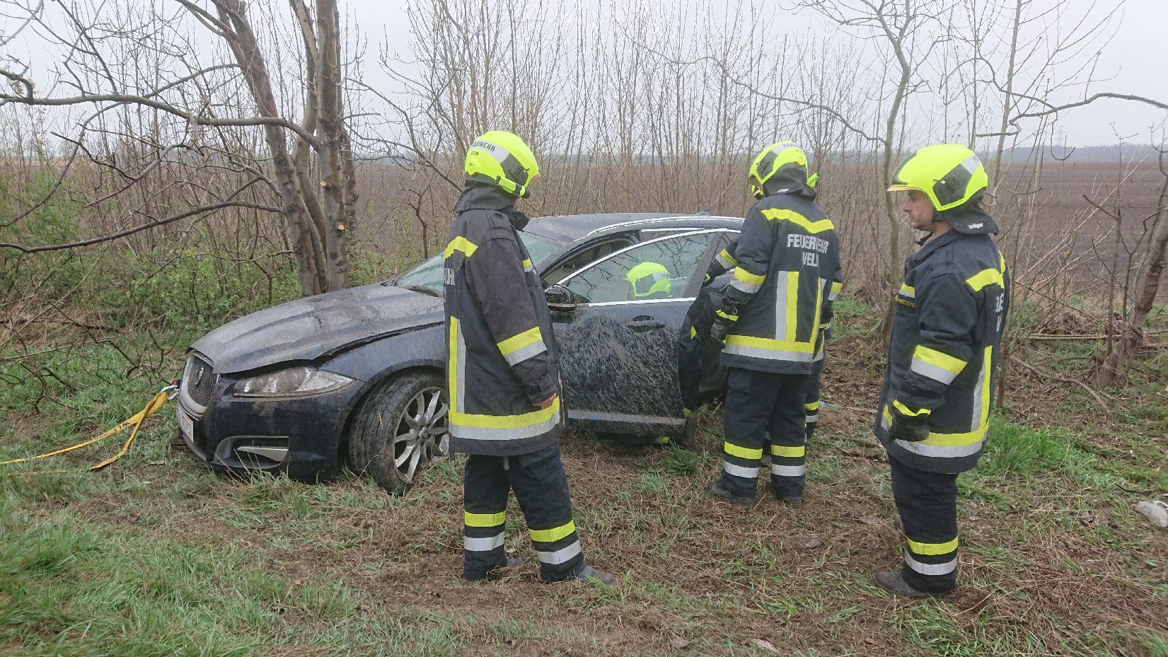 Unfall-Fzg. von Bäumen befreit, mit Motorsäge freigemacht, Fzg. verladen und zur Velmer Verwahrungsstelle gebracht |