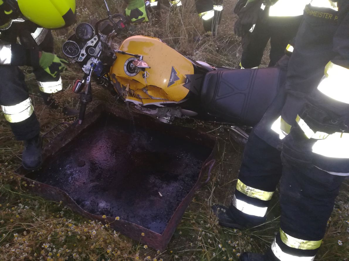 Treibstoff vom Unfall-Motorrad abgelassen, Fzg. verladen und zur Velmer Verwahrungsstelle gebracht |